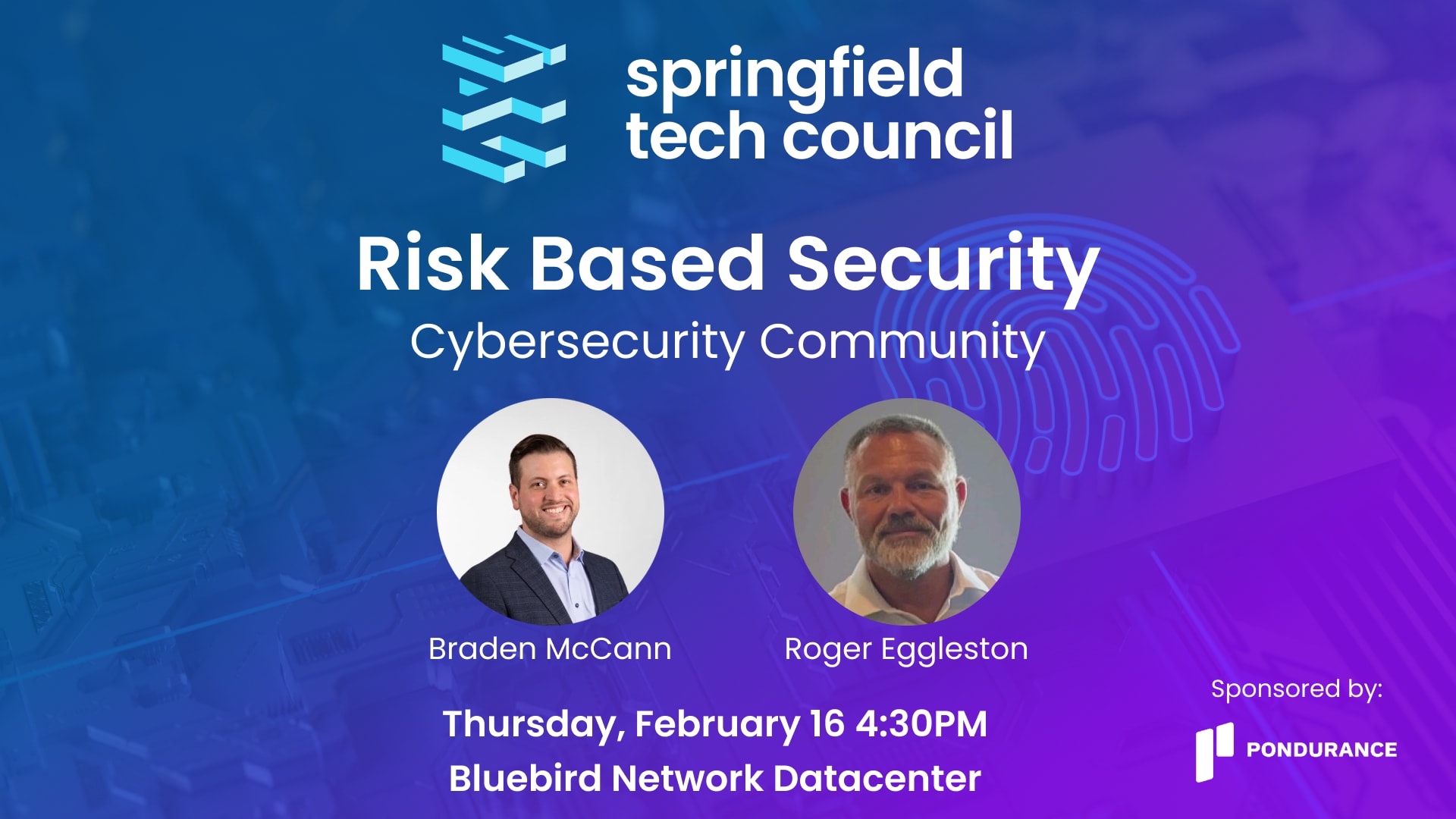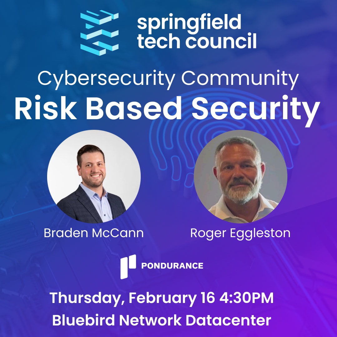 Join us for our first Community Cybersecurity Event of the year where Braden McCann and Roger Eggleston of Pondurance lead a discussion around Risk Based Cybersecurity. Braden and Roger act as guides on our journey to learning how we maximize resources while ensuring we minimize exposure to threats across our environments. Check-in/Networking, including Pappo's Pizza and fruit/vegetable spreads, begins at 4:30pm with the presentation following at 5:30pm. Thank you to Pondurance for sponsoring this event!